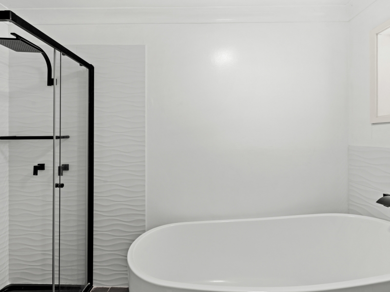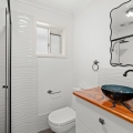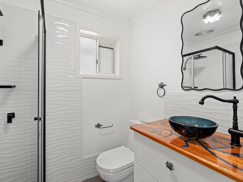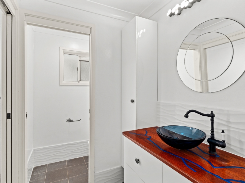 • 3 Way Main Bathroom, with freestanding bath, shower, separate toilet & a custom made vanity with feature benchtop.